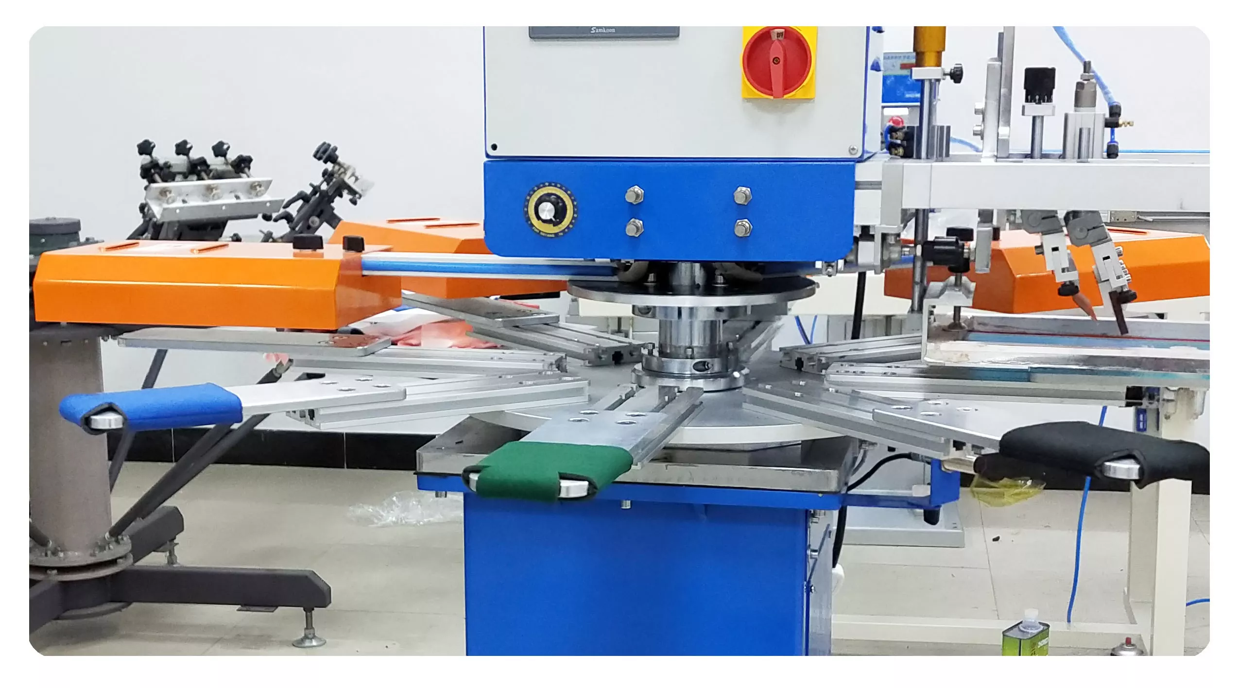 5. De roterende werktafel bevat acht stations: één voor laden, één voor afdrukken, twee voor drogen en één voor lossen, waardoor vijf stations tegelijkertijd kunnen werken.