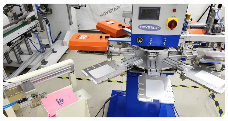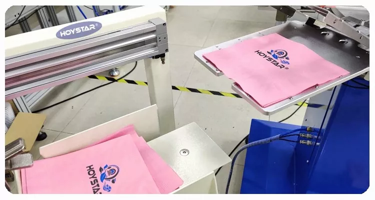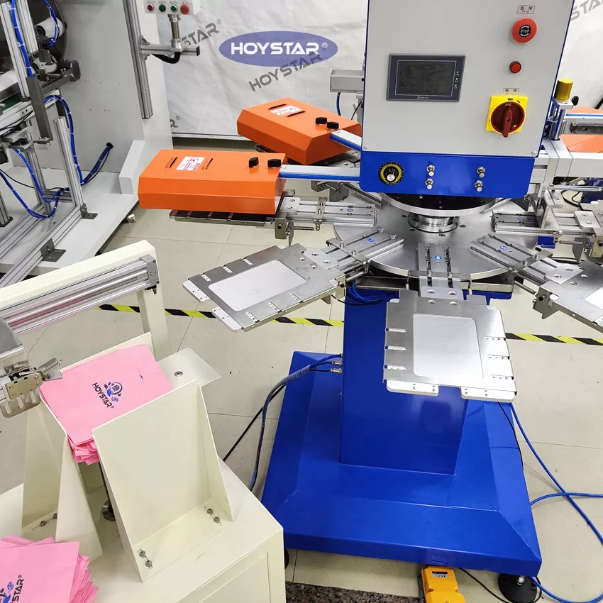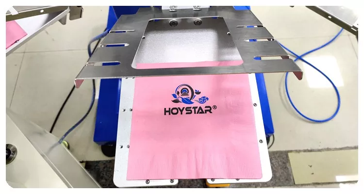 HOYSTAR is een betrouwbare fabrikant en leverancier in China; deze HOYSTAR automatische 2-kleuren servetzeefdrukmachine is speciaal ontworpen voor het volledig automatisch afdrukken op servetten. Het gestroomlijnde drukproces verloopt als volgt: de servetten handmatig in de machine laden – automatisch afdrukken van de eerste kleur – automatisch drogen – automatisch afdrukken van de tweede kleur – automatisch drogen – automatisch uitladen – en automatische productinzameling.