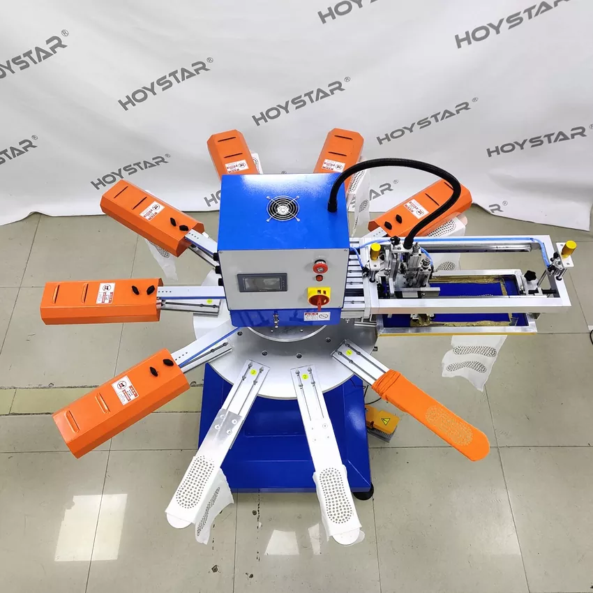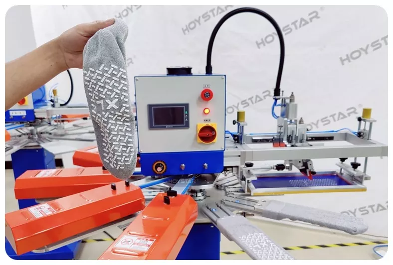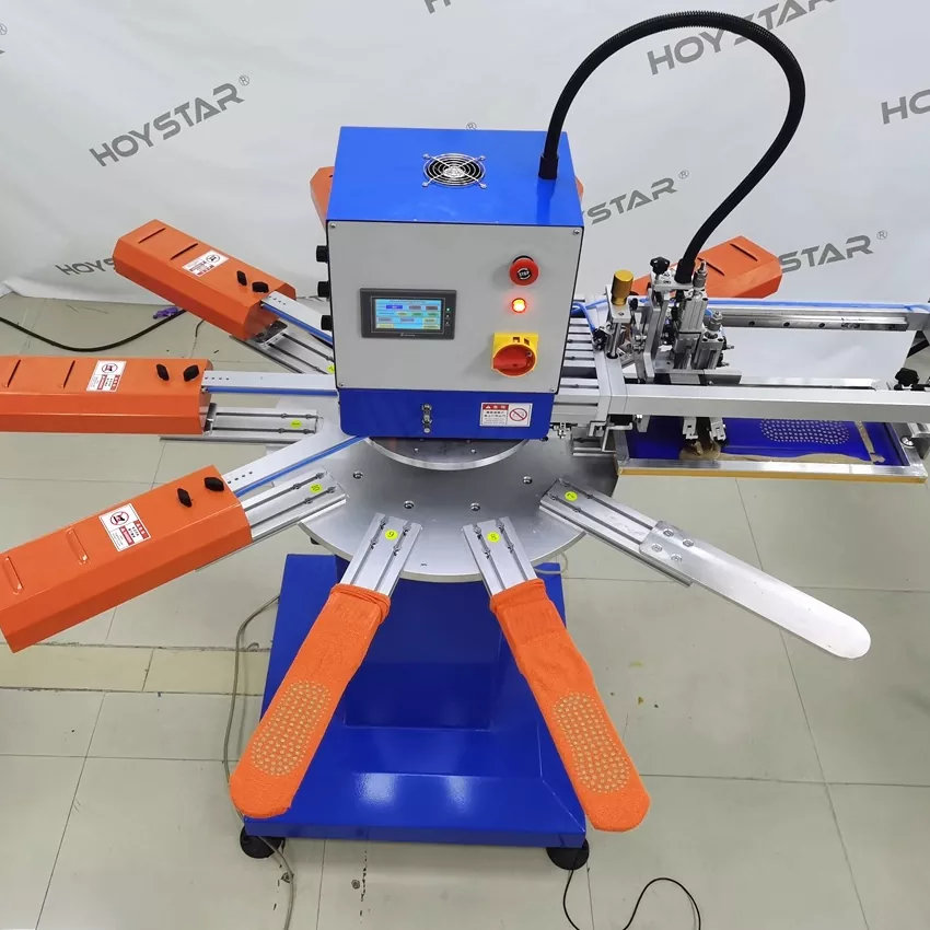 Als professionele fabrikant en leverancier is HOYSTAR High Rapid zeefdrukmachine voor sokken ontworpen voor toepassingen in de textielbrei-industrie. Met een snelheid tot 1000 stuks per uur is het geschikt voor het bedrukken van antislipsokken, babysokken, sokken voor volwassenen, voetbalsokken, enz. Uitgerust met een roterende werktafel, is het erg handig om sokken te laden en te lossen. PLC-aanraakschermbediening, zeer eenvoudig te bedienen. Machine uitgerust met een droogsysteem kan het silicium en de inkt goed drogen.