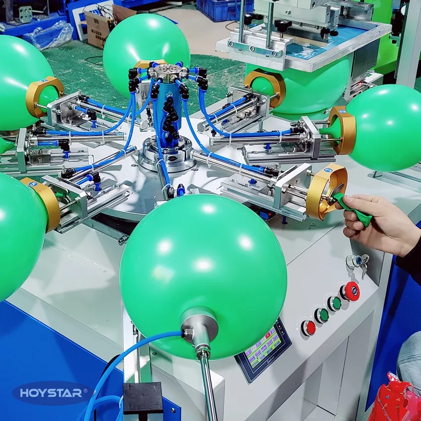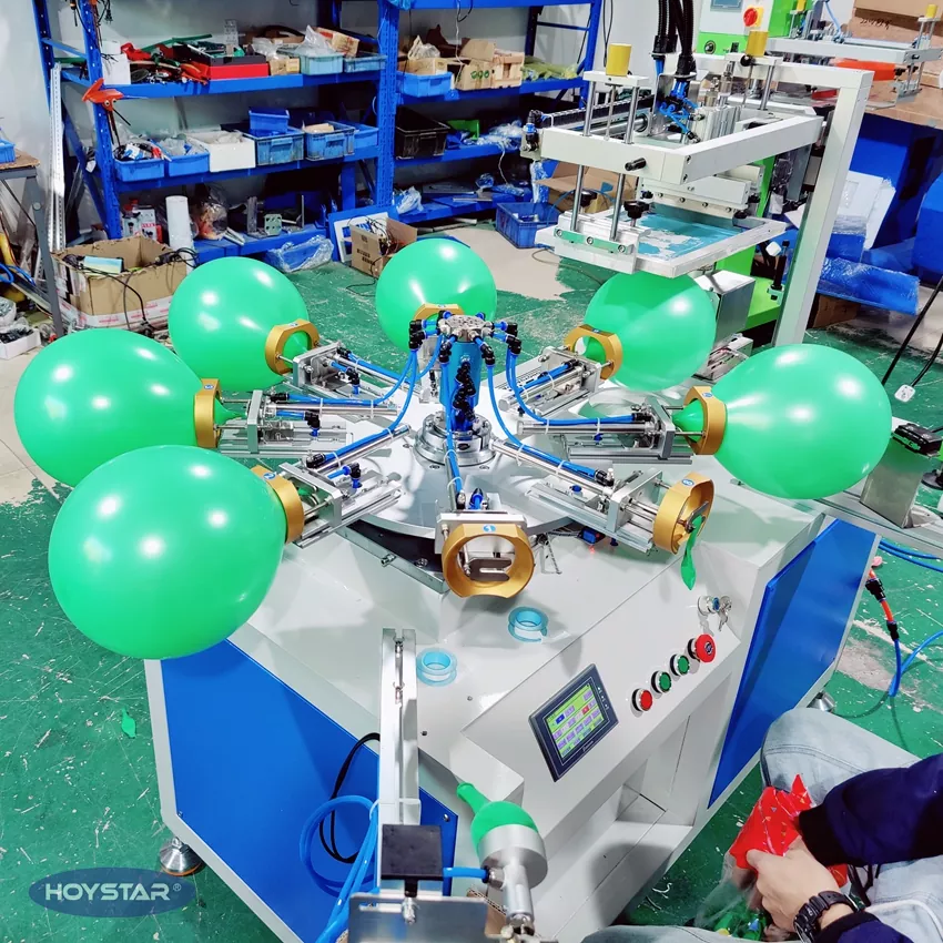 HOYSTAR is een betrouwbare fabrikant en leverancier in China; Deze HOYSTAR latexballonzeefdrukmachine met één kleur is ontworpen voor het bedrukken van latexballonnen. Uitgerust met roterende werktafel, automatisch blazen, automatisch roteren, automatisch drogen, automatische losfuncties. PLC-aanraakschermbediening, gebruiksvriendelijke interface voor veilige, intuïtieve bediening. De machine combineert snelheid, precisie en gebruiksgemak.