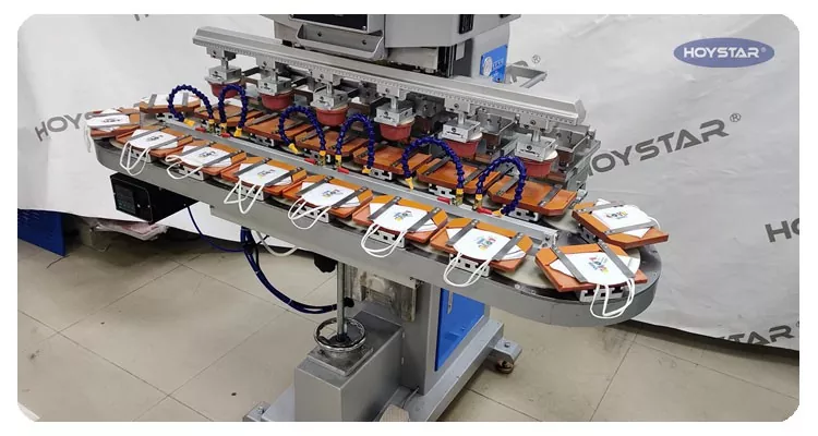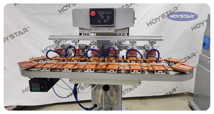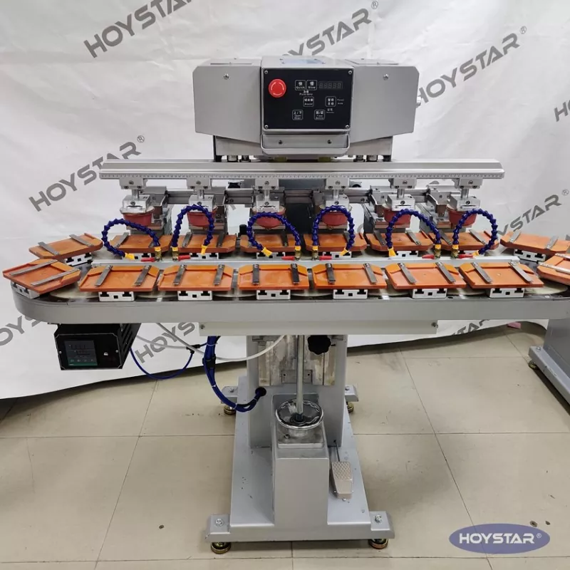 Als professionele fabrikant in China willen wij u een hoogefficiënte HOYSTAR zeskleurenkussenprinter met transportbandwerktafel bieden. Deze machine maakt continu zeskleuren tampondruk voor producten mogelijk, waarbij één kleurregistratie in één cyclus wordt voltooid. Deze machine maakt gebruik van een roterend draaitafeltransportsysteem, dat een continue en soepele productoverdracht gedurende het hele drukproces mogelijk maakt, en de mogelijkheid biedt om volledige 6-kleuren overdruk in slechts één roterende cyclus te voltooien. Vergeleken met shuttle-padprinters is de snelheid erg hoog.